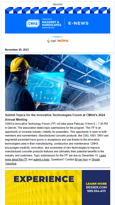 CMHA E-News is an Industry focused digital newsletter. E-News is distributed bi-weekly to multiple market segments within the manufactured concrete products community. Review our rate card and ad specs below. Take a look at a recent issue of E-News. If you would like to learn more about advertising in E-News please contact Janis Mason.