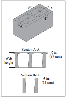 Included in ASTM C140 since 2012 is testing to determine minimum normalized web area. Its purpose is to ensure that the unit has sufficient web material connecting the face shells. It replaces the equivalent web thickness criteria in previous versions of the standard. To determine the normalized web area, the minimum thickness and height of each web is measured and used to calculate the total web area of the unit. This total web area is divided by the nominal unit face area to determine normalized web area in in.²/ft² (mm²/m²).