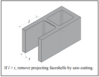 - Unsupported projections with a length exceeding the projection thickness must be removed by saw-cutting (see Figure 2). For units with recessed webs, the face shell projecting above the web is removed by saw-cutting to provide a full bearing surface over the net cross-section of the unit, as shown in Figure 3.