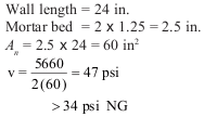 The flexural strength of a surface bonded wall is about the same as that of a conventional mortared wall, as shown in Figure 1. When walls are tested in the vertical span (i.e., a horizontal force, such as wind, is applied to a wall that is supported at the top and bottom) surfaced bonded walls and mortared walls have about the same average strength; failure occurs in the surface bonded coating due to tensile stress at or near one of the horizontal joints. With mortared construction, failure occurs at a horizontal joint with bond failure between the mortar and the masonry units. The data from numerous tests on surface bonded constructions led to an allowable stress of 18 psi (0.12 MPa) based on the gross area.