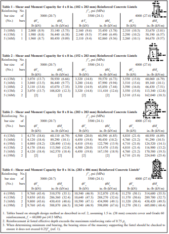 Tables 1 through 4 list design moment and shear strengths for various precast lintel sizes and concrete strengths, based on the following criteria (ref. 2).