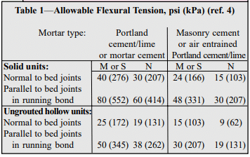 allowable tensile stress in masonry, Ft, for hollow ungrouted concrete masonry normal to the bed joints is as noted in Table footnotes.