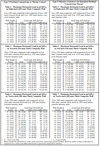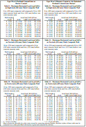 Tables 2 through 13, for lateral loads with or without concentric axial loads (see Figure 1), are based on Chapter 2, Allowable Stress Design, of Building Code Requirements for Masonry Structures (ref. 4) and the following: