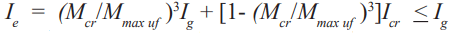 Deflection criteria for lintels is based on controlling cracking in the masonry being supported. Consequently, less deflection is allowed when the lintel supports unreinforced masonry. In this case, lintel deflection is limited to the effective span of the lintel (measured in inches) divided by 600 (L/600) (ref. 1). In addition, ACI 318 limits precast lintel deflection to L/240 when the element supported by the lintel is not likely to be damaged by large deflections, and L/480 when the element supported by the lintel is likely to be damaged by large deflections. Lintel deflection is calculated based on the effective moment of inertia, Ie, as follows (ref. 2, Section 9.5.2.3).