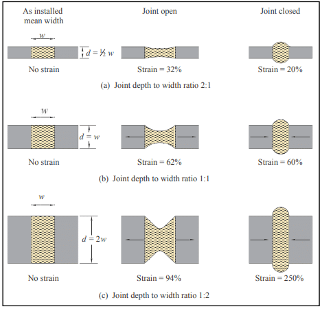 Sealant shape factor refers to the mean width versus mean depth of the sealant as installed in the joint. This ratio is important because it affects the amount of strain the sealant is exposed to as the joint moves, as well as the amount of sealant required to fill the joint (see Figure 1d). Sealants exposed to less strain can typically be expected to have a longer life, all other factors being equal. As illustrated in Figure 2, wider and shallower sealant profiles generally reduce strain and require less sealant.