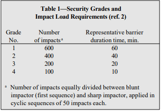 The draft standard also assigns a representative barrier duration time, based on an historical testing observation that sustained manpower can deliver 400 blows of 200 ft-lb (271.2 J) each in 45 minutes. The element of time assigned to the various security grades is adjusted to achieve more manageable time periods than actual calculations provide. The amount of time is estimated and is offered solely as supplementary design information to assist the user in matching security grades with the attack resistance times and staff response times required for each barrier in the facility.