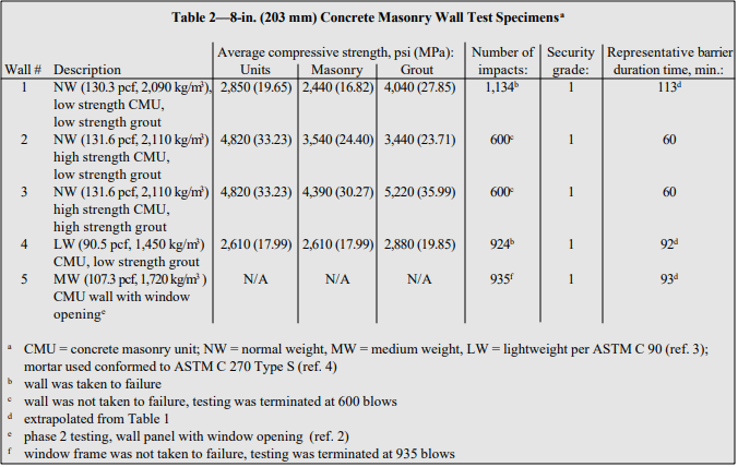 Five concrete masonry wall assemblies were tested (refs. 1, 2), and are described in Table 2. All five concrete masonry walls were able to withstand 600 blows and therefore achieve the Grade 1 rating in accordance with the draft ASTM standard for security walls. Additionally, the back side of each wall assembly was monitored after each sequence of 50 blows and no penetration or damage, including minor cracks, was observed during the 600 blows.