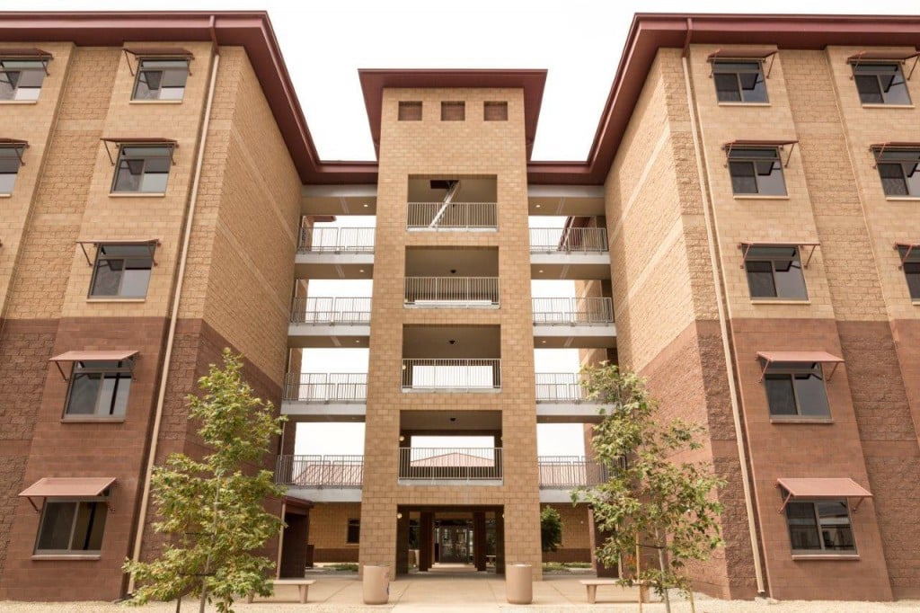 Analysis of the BEQ site, its prevailing winds and its solar orientation, along with vehicular and pedestrian circulation, led to an L-shaped campus for this section of 41 Area, according to Bodenhamer. That shape helps create the sense of a smaller community within a larger town. The all-CMU construction BEQ buildings are connected by a series of walkways with resort-style activity courtyards, basketball courts, horseshoe pits, and volleyball, along with an outdoor amphitheater at the east end of the promenade. There are also picnic shelters, and covered barbeque areas constructed of CMU columns with standing metal seam roofs to minimize maintenance, says Bodehamer.