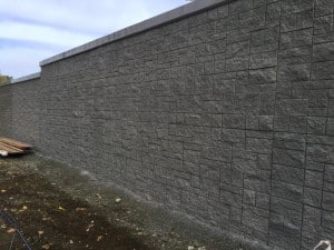 Atkinson dug a footing every 14 feet (4.3 m) for pilasters constructed from 16-inch square column block filled with 6,000 psi (41.3 kPa) grout, rebar and lateral ties. The CMUs manufactured by local producer were placed on a 2 ft (61 cm) deep leveling pad made of free-draining aggregate. “We went with gray block that was stained washington gray” said Reynolds.