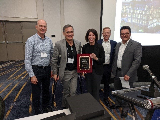 At the 2019 Canadian Activities Meeting, the Interlocking Concrete Pavement Institute recognized Richard Morin, ing, M, Sc. A. for his efforts to support the use of segmental pavements in the City of Montreal by presenting him with an Honorary Membership in the association. Mr. Morin, who is a Technical Advisor for the City of Montreal’s Infrastructure, Roads and Transport Department, Infrastructure Directorate, Division of Expertise and Technical Support, will be retiring from that role in January 2020. Lincoln Paiva, ing., Director – Technical Services, Techo-Bloc briefly introduced Mr. Morin and thanked him for his efforts to help institutionalize segmental pavement systems in the City of Montreal and Canada. Mr. Morin was presented a plaque by ICPI Board Chair Kendall Anderegg and Yvan Bolduc, Bolduc Concrete Products and Charles Ciccarello, Techo-Bloc, who had both submitted letters of support to the ICPI Board of Directors.