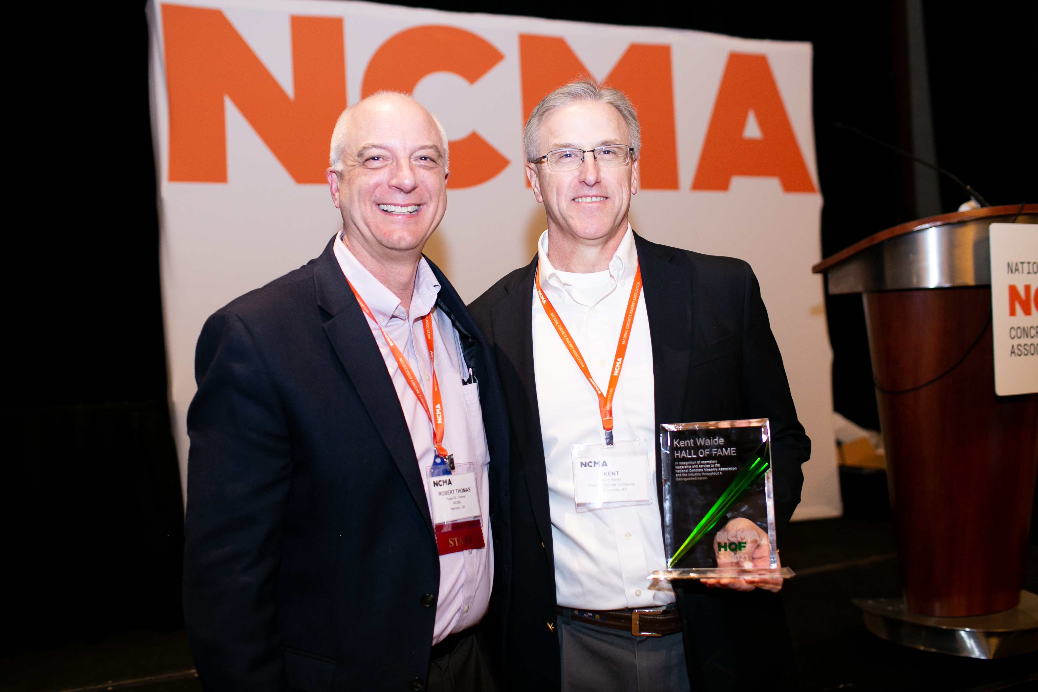 Kent Waide, former owner of Ruby Concrete Company in Madison, Kentucky, was presented with NCMA’s Hall of Fame award on March 2, 2022, at the association’s Annual Meeting held at The Westin at Crown Center in Kansas City, Missouri.