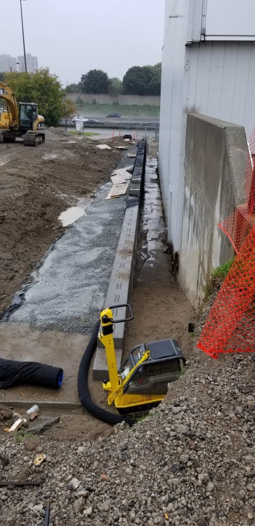 The job was a tricky one. The objective was to maintain access to an emergency exit at the base of the highrise next door. The construction zone was very narrow due to the highrise being right on the property line and the presence of utilities under the main access road onto the new site. A deep layer of uncompacted “junk” backfill right under the construction zone complicated the matter further, according to Glenn Herold, P.Eng., M.ASCE, Director Commercial Solutions with CMHA member Oaks Landscape Products, a division of Brampton Brick. In that capacity, he assists customers with a wide range of engineered solutions with segmental retaining walls and concrete pavers.