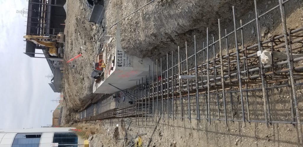 Developers initially examined the idea of digging down to good native soil and constructing a cast-in-place retaining wall. “The cost of that solution was just astronomical. So the design team came in and asked us if there was any other way,” Herold said. “Can we possibly figure out how to build a segmental retaining wall on the site?”