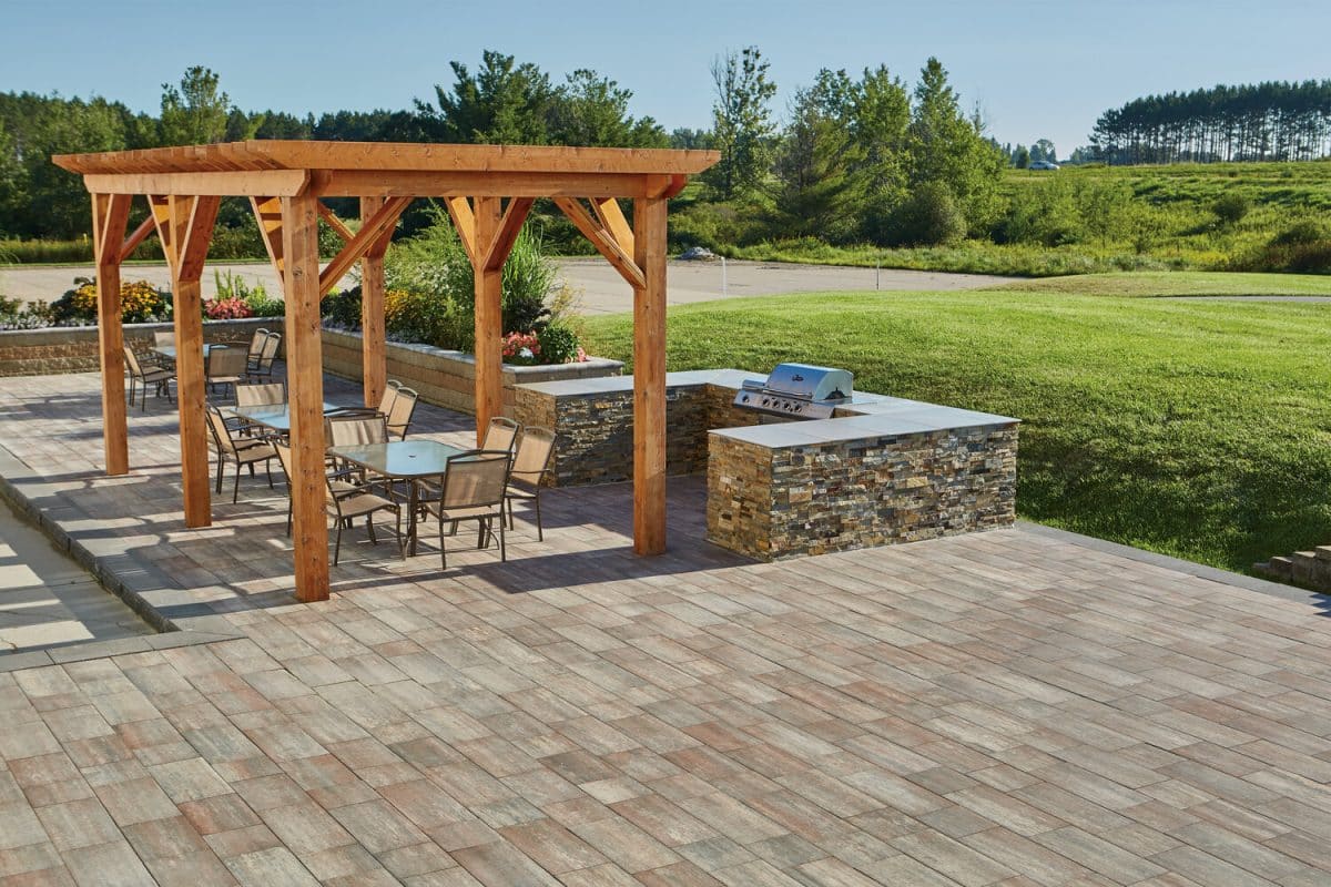 After opening a new office space for rent in a former Wal-Mart building, this business owner wanted an impressive outdoor area for his employees’ wellbeing. Because this building is a rented space, there were several unique challenges brought to the project’s design and installation. Namely, the building’s property could not be physically altered; when they left the building, the site needed to be in the same condition. To overcome challenges, the concrete paver patio project was carefully designed and constructed to integrate on top of an existing concrete slab. While the slab defined the size of the project, it also presented other challenges: the ground could not be dug up to create a foundation for pavers and retaining walls. To solve this, the contractor mortared the retaining wall into place on top of the concrete slab. Each wall unit was individually leveled then mortared because of the slab’s uneven surface. The combination of pavers and slabs were manufactured by County Materials Corporation. There was expansive application of pavers surrounded by tall retaining walls to block the sound of passing traffic. An outdoor grill and kitchen area doubles as an ideal spot for work celebrations or to take a lunch break. The project was a HNA Award Recipient