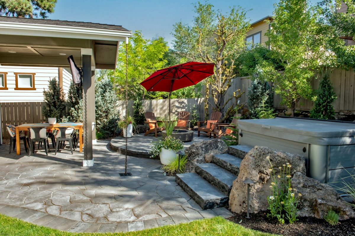 Project designers had extensive meetings with the homeowners to ensure this project included everything they wanted while staying under budget. The installers matched the pavers to the home’s exterior paint. The beautiful mocha pavers strongly contrasted with the natural freckled stones in front of the fence and around the hot tub. Rough-cut pavers were used for both the patio and fire pit. All the pavers, stones, trees, and wooden furniture around the fire pit, patio, and hot tub created this feeling of a forest oasis within a suburban backyard. To prevent a jarring contrast to the grass-lined play area, the designers laid down the same pavers used for the patio and fire pit area to connect the patio to the swing set and create a cohesive yard that checked off every goal for the homeowners.