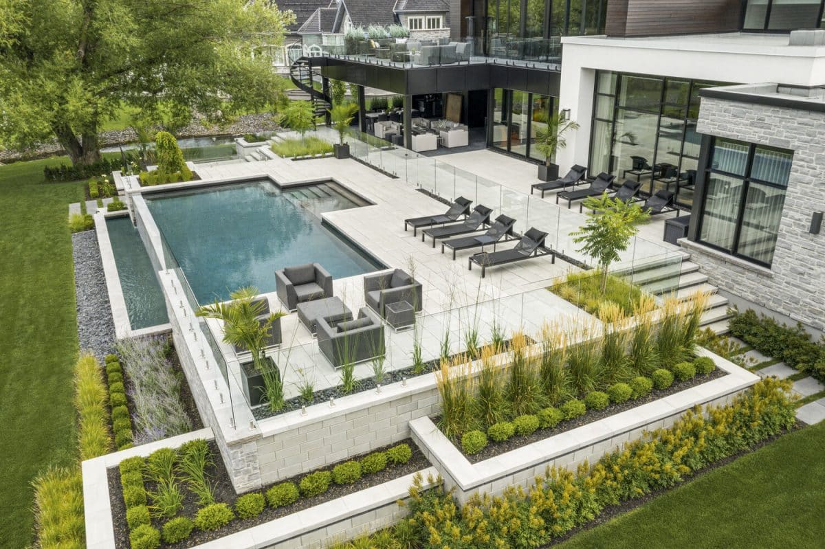 This show stopping property boasts six Techo-Bloc products in a range of color, texture, and scale. From a larger than life driveway with Sleek pavers, a jaw dropping entrance with Victorien, Raffinato wall and caps, a firepit sitting area with Blu 6 x 13 in contrasting colors and a raised backyard patio with an inspiring poolside, staircase, and flower beds. This project was a HNA Awards recipient.