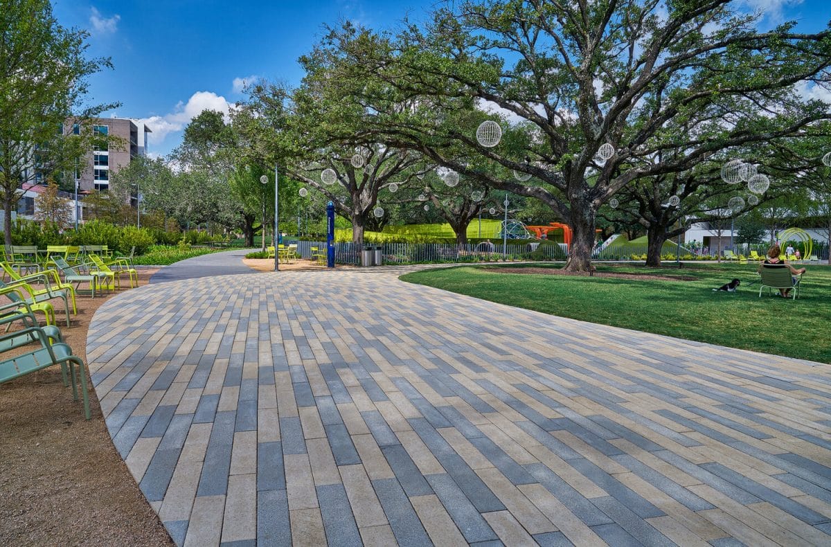 The clients decided to use concrete pavers. The chosen pavers were able to integrate with the longstanding historical elements, while adding an artful refresh to the park. The transformation included native landscaping, interactive water features, a dog park, garden, park pavilion and children’s play area. Pavers helped create and define each of these spaces through use of colors, shapes and inlay patterns. Variegated and whimsical paver patterns invoke a sense of spirited movement and fun. The use of multiple paver shapes, colors, and upgraded textures added depth and beauty to this cunningly conceived urban space, by accenting native grass areas and designating different park sections. The central grand walkways gracefully arc throughout the space with large plank style pavers, creating a modern boardwalk feel.