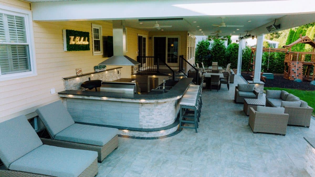 The owners wanted a dedicated entertainment area, with an outdoor bar and patio space made with pavers, to help maximize the use of their backyard. They also wanted an outdoor kitchen behind the bar to increase time spent with family and friends while hosting spring and summer events.