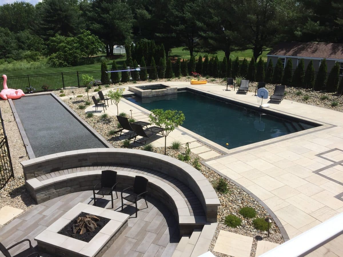 The main design intent for this backyard resort was to ensure there would be enough space for entertaining large crowds of friends and family. There needed to be multiple gathering spaces all serving different purposes for the guests and homeowners. The main focal point of the project is the pool with a large patio space to connect all the different spaces and functions of the backyard. Some of the design features include a large outdoor kitchen, a seating area to watch the sunsets each night, an over-sized sunken fire pit area and a bocce ball court. A concrete paver solution provided the best option to incorporate all of the outdoor features. They decided to use concrete pavers manufactured by Techo-Bloc which are both durable and visually appealing. The owner was very satisfied with the outcome of the project and it was a HNA Awards recipient.
