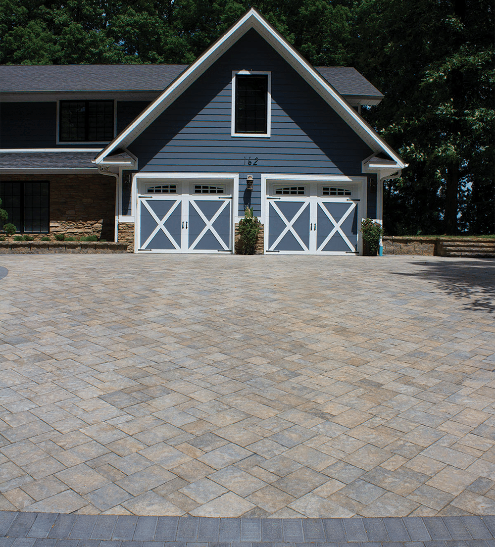 SRW and pavers were chosen due to their size and the right colors which coordinated well with the home color. The warm earth-tone pavers and wall/caps selected excellently contrasted against the cool undertones of the home’s dark blue exterior paint. The designers tied the exterior ash blue color into the hardscape design by using color-matching pavers to give a distinct separation between the SRWs and pavers that made up the driveway and walkways. The muted pavers made the home pop against the neighboring homes.