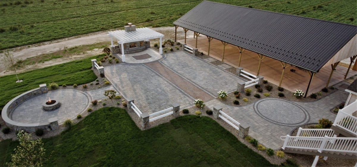 The goal of the project was to seamlessly incorporate hardscapes in a unique way to transform a barn into a wedding venue. The project ran into some complications when the area had to be filled with 107 tons of dirt to level out the land. Due to the ground being too smooth, crews had to compact it and add geotextile to finish up with a 12″ base (231 tons). The project decided to use a combination of different product types, which were manufactured by Belgard and Techo-Bloc. With a combination of hardscape materials, the design was able to incorporate different materials and colors through the masonry work. The different textiles and shapes came together to create a beautiful and unique barn venue, as shown in the picture above. This project was a HNA Awards recipient.