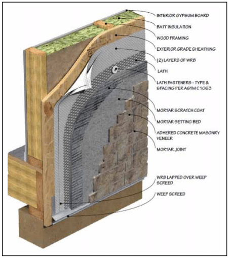 ASTM C1780, Standard Practice for Installation Methods for Adhered Manufactured Stone Masonry Veneer, (ref. 3) requires two separate layers of water-resistive barrier (WRB) to be installed over wood sheathing in exterior applications. The standard also requires that the two separate layers be installed in shingle fashion. Starting from the bottom of the wall, the inner layer of WRB should be installed, along with flashings, to create a drainage plane. The upper layer of the WRB should lap the top of the lower layer by a minimum of 2 in. (51 mm). The vertical joints of the WRB must be lapped a minimum of 6 in. (152 mm). Inside and outside corners must be overlapped a minimum of 16 in. (406 mm) past the corner in both directions. The WRB should be installed in accordance with the manufacturer’s recommendations and be integrated with all flashing accessories, adjacent WRBs, doors, windows, penetrations, and cladding transitions. The outer layer of WRB is intended to keep the scratch coat from contacting the inner layer of WRB and may be of a different material than the inner WRB.