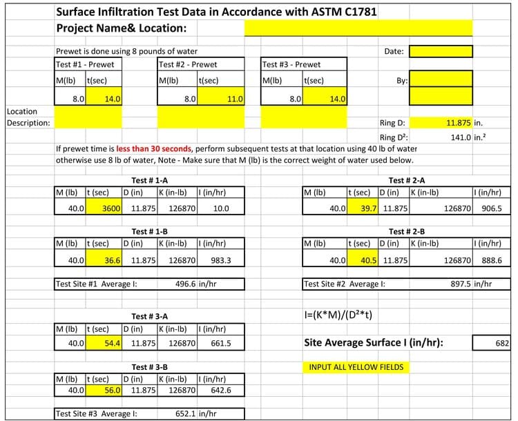 This sheet provides input values for the formula in ASTM C1781 Standard Test Method for Surface Infiltration Rate of Permeable Unit Pavement Systems that calculates that rate in inches per hour. The test also indicates how long water stands on the surface which can indicate when cleaning should be done to prevent clogging. The sheet provides inputs for 8 lbs (5 kg) of water for the wetting step and 40 lbs (18 kg) for the testing step, thereby providing instant answers.