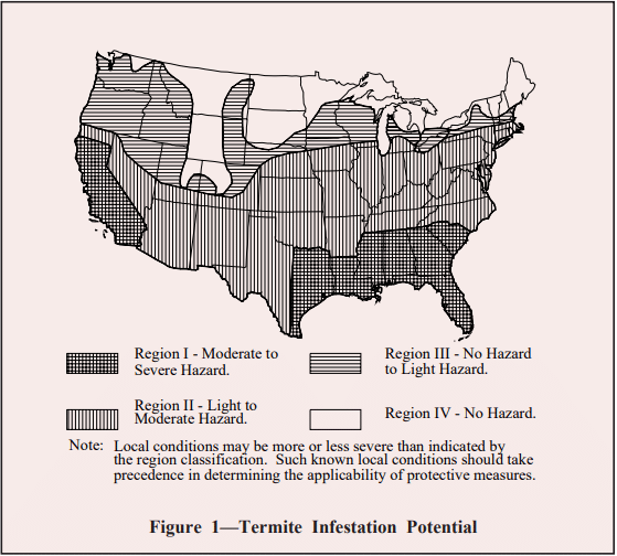 The level of termite control employed on a particular job should be consistent with the expected severity of the termite hazard. This level of severity for a particular location can be determined from local experience or from the state entomological authorities. Where such information is not available, Figure 1 may serve as a guide.