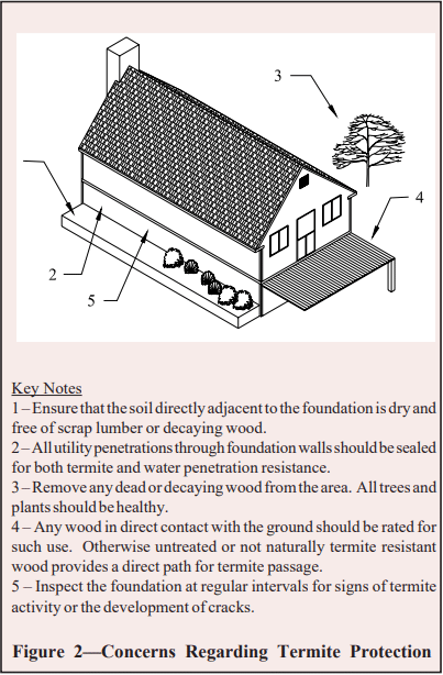 While preparing the site prior to construction, all roots, stumps, dead timber, and other wood debris should be removed from the site. Similarly, wood scraps from construction should be properly disposed. Leaving this material on site or in the backfill provides additional food sources for termites, attracting them and increasing the likelihood of infestation. Similarly, wood grade stakes or bracing stakes should be removed before or during a concrete placement and not be cast into the concrete. Leaving them in place attracts termites and provides a direct path for them through the concrete. Refer to Figure 2 for a summary of critical termite access areas.