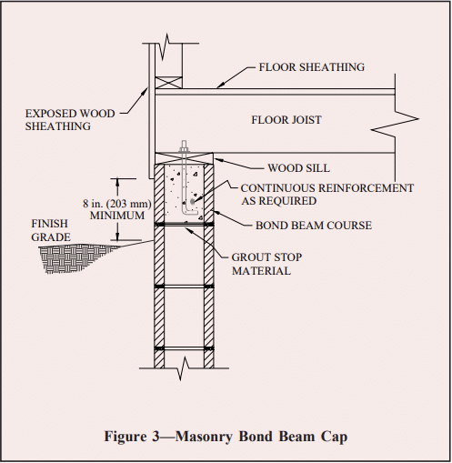 Various methods are used to seal the tops of masonry foundation walls. Should termites penetrate the face shell of a concrete masonry wall below, the cap prevents them from direct access to the wood superstructure. In reinforced construction, the masonry bond beam at the top of the wall serves as an effective cap, as shown in Figure 3.