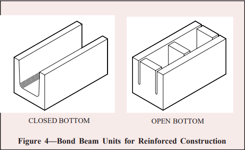 Bond beam units are specifically designed to accommodate horizontal reinforcement and grout as shown in Figure 4. Bond beam units can be either solid bottom or open bottom. The latter requires a screen grout stop or expanded metal to contain the grout within the unit. A reinforced bond beam is preferred to solid units or solid bottom units with solid head joints since the reinforcement in bond beams will hold any cracks that form tightly together to prevent termite entry through the cracks.