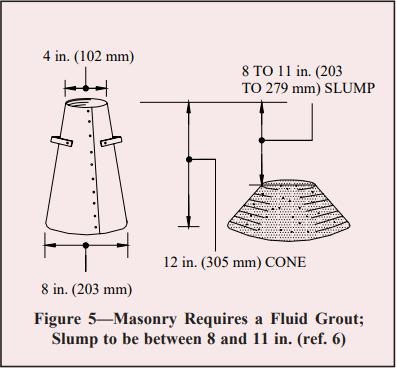 Proper grouting procedures are important to ensure bond with the masonry units and void free areas in bond beams and cells to be filled. Grout should conform to the Specification for Grout for Masonry, ASTM C476 (ref. 7) or be specified to have a minimum compressive strength of 2,000 psi (13.8 MPa) at 28 days in accordance with the Specification for Masonry Structures, ACI 530.1/ASCE 6/TMS 402 (ref. 6). The Specification also requires enough water in the grout mixture to achieve a slump of 8 to 11 inches (203 to 279 mm) (ref. 6, 4) when tested in accordance with ASTM C143 Standard Test Method for Slump of Hydraulic Cement Concrete (ref. 9). See Figure 5.