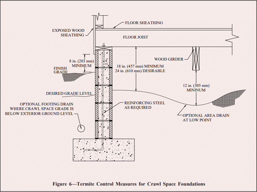 Figure 6 illustrates termite control measures for crawl space foundations. Crawl space floors should be kept at or above the exterior finished grade to facilitate drainage in the crawl space. Where this is not possible, or on sites where water flows toward the building due to the site slope, area drains should be installed. Unless specified otherwise by local codes, wood girders should be at least 12 inches (305 mm) above the crawl space floor, and wood joists should be no closer than 18 inches (457 mm) to the soil. In all cases, enough clearance should be maintained to allow access to the crawl space for inspection.