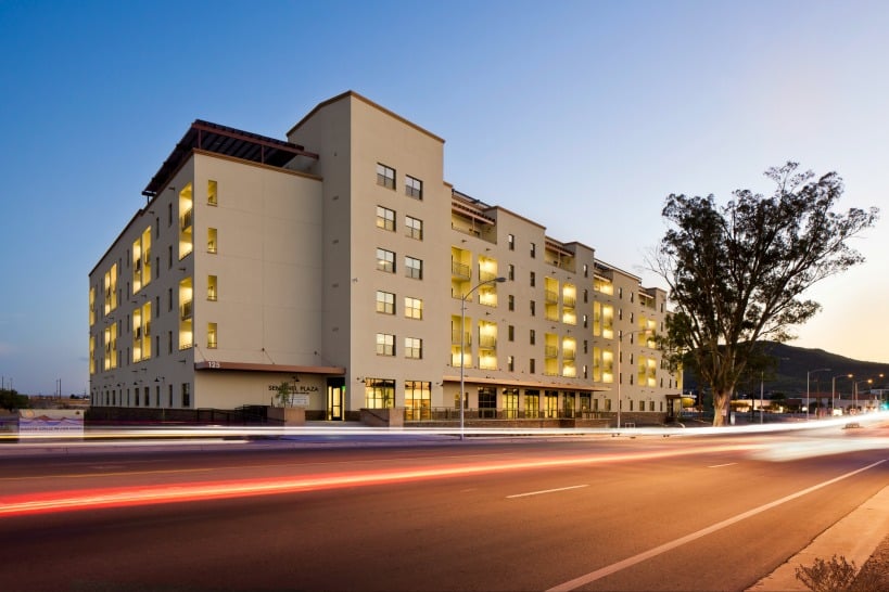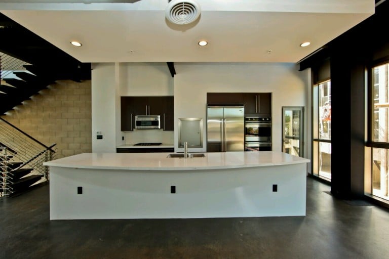 A restriction to using only concrete block, in only a few colors on the mixed-use complex was not limiting, says Bodenhamer. “It is a regular size, modular building component that actually provides lots of flexibility when the variety of finishes, textures and colors are considered.” Nearly three-quarters of the exterior CMU Vasquez Marshall specified is architectural block, with an enhanced finish, arranged in textures and patterns to break up the building mass and to highlight some of the building elements. Darker, split-face block is used on the lower portion of the buildings to establish a visual base and maintain a clean appearance. Meanwhile, the architects used highlighted horizontal accent bands of CMU to tie the building elements together and define openings around windows and doors.